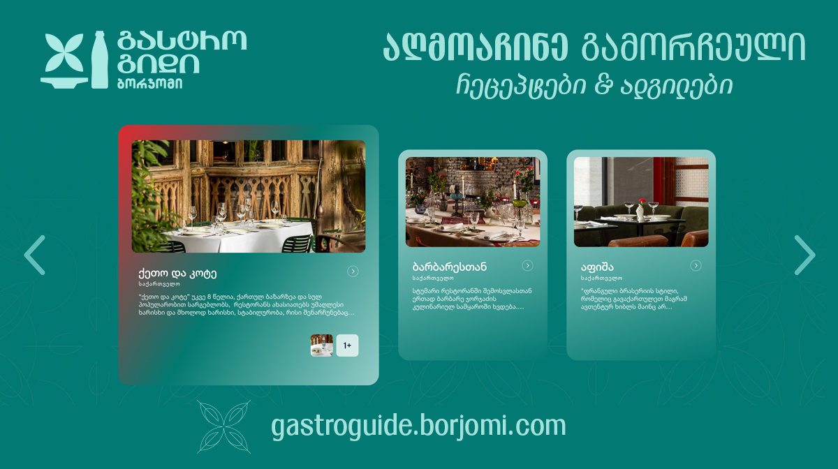 „ბორჯომი” უკვე 135 წელია ქართული სუფრის და კულინარიის განუყოფელი ნაწილია. სწორედ ამიტომ, ჩვენ ვაგრძელებთ გასტრონომიული მიმართულების განვითარებას და მომხმარებელს უნიკალურ ციფრულ გამოცდილებას - რესტოგიდს ვთავაზობთ. პლატფორმა საერთაშორისო მასშტაბით სულ ცოტა ხნის წინ წარვადგინეთ და „ბორჯომის” ვახშმების სერიით კიდევ უფრო თვალსაჩინო გავხადეთ ის იდეა, რის გარშემოც გასტროგიდი შეიქმნა. პროექტის წარდგენისთვის განსაკუთრებული ადგილები შევარჩიეთ და ქართველ შეფმზარეულებთან ერთად, სტუმრებს განსხვავებული კონცეფციის ვახშმებზე ვუმასპინძლეთ.”