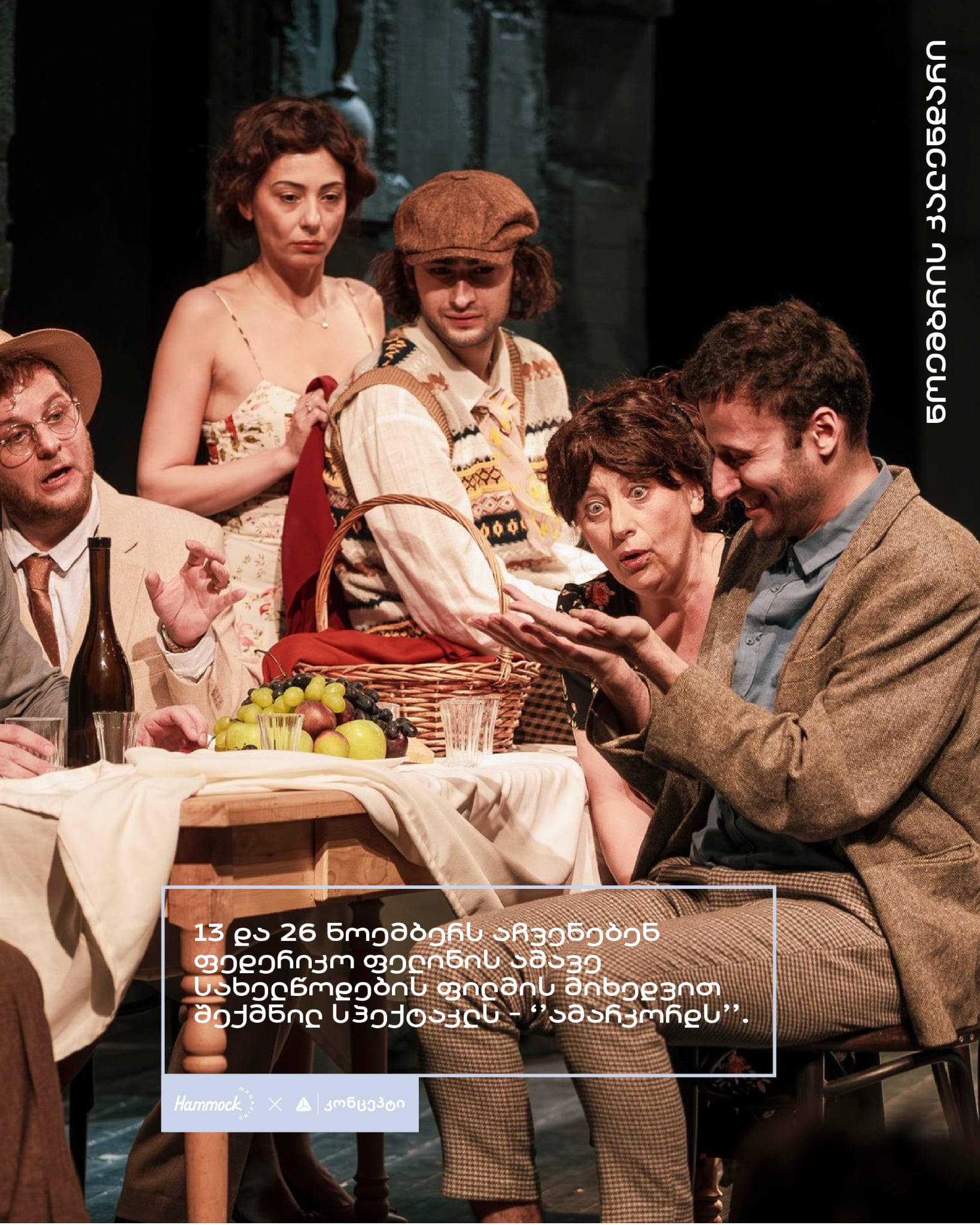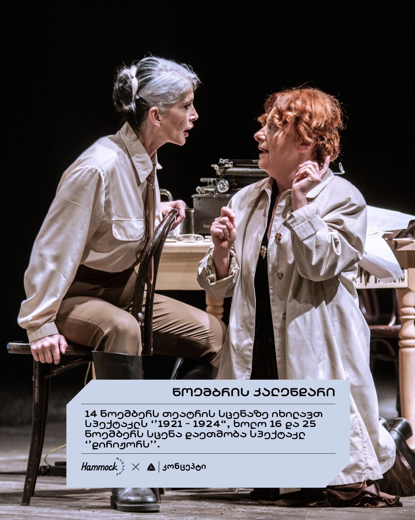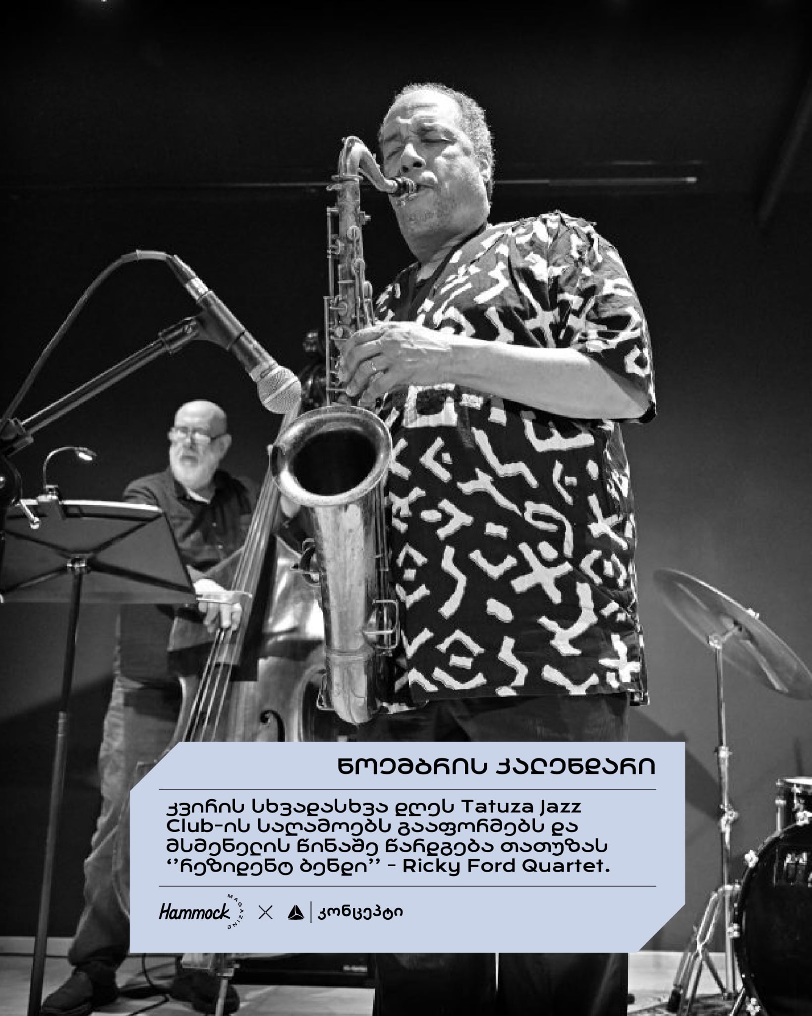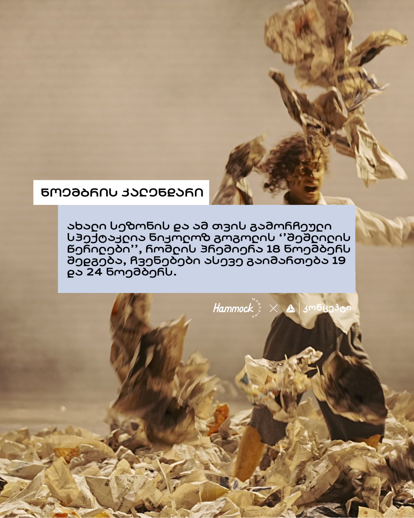 edfe1d50-3ab4-4e12-8df9-a0c17fcd4ed1.jpeg227.53 KB14 ნოემბერს თიბისი კონცეპტის გალერეაში იხსნება დავით მესხის და ტონი ჯასთის ერთობლივი გამოფენა, სახელწოდებით "ჩვენ მაძიებლები ვართ". გამოფენის კურატორია გალერეა "ელ ცე კვაისარ" და 2026 წლის 5 თებერვლამდე გაგრძელდება. 0303ea37-dfa2-474c-85d9-956f147874e9.jpeg308.05 KBახალი სეზონის და ამ თვის გამორჩეული სპექტაკლია ნიკოლოზ გოგოლის ‘’შეშლილის წერილები’’, რომლის პრემიერა 18 ნოემბერს შედგება, ჩვენებები ასევე გაიმართება 19 და 24 ნოემბერს. სპექტაკლის დამდგმელი რეჟისორი და სცენოგრაფია ლევან წულაძე, კოსტიუმების მხატვარი - ნინო სურგულაძე, ხოლო მუსიკალური გაფორმება ზურაბ გაგლოშვილს ეკუთვნის.7e0f26c6-f230-4871-9c0a-3943ff1e7252.jpeg265.62 KB12 ნოემბერს გაიმართება ''ვერაგობა და სიყვარულის” ჩვენება, რომელიც ფრიდრიხ შილერის პიესას ეფუძნება. a6fc86cb-20b2-40ec-b267-9540f8459106.jpeg484.83 KB13 და 26 ნოემბერს აჩვენებენ ფედერიკო ფელინის ამავე სახელწოდების ფილმის მიხედვით შექმნილ სპექტაკლს - ‘’ამარკორდს’’. dcd1bed1-c661-4151-bc9c-91539d725022.jpeg387.92 KB14 ნოემბერს თეატრის სცენაზე იხილავთ სპექტაკლს ‘’1921 - 1924“, ხოლო 16 და 25 ნოემბერს სცენა დაეთმობა სპექტაკლ ‘’დირიჟორს’’. 993a60f5-0ee7-41de-80ff-af39cb10ae6c.jpeg350.97 KBამ სეზონის კიდევ ერთი საინტერესო სპექტაკლია ‘’ცხვირი“, რომელიც ნიკოლოზ გოგოლის მოთხრობის თავისუფალი ინტერპრეტაციაა და მისი ჩვენება 17 ნოემბერს გაიმართება. თეატრის - „სახელოსნო 42-ის“ გენერალური სპონსორია თიბისი კონცეპტი.c916ffa1-d70f-4e9f-9e59-2c8c199570a1.jpeg459.8 KBრაც შეეხება Tatuza Jazz Club-ს, ტელეგრაფში მდებარე ჯაზკლუბი ყოველთვიურად მასპინძლობს გამოჩენილ უცხოელ და ქართველ მუსიკოსებს. თვის განსაკუთრებულ საღამოს გამართავს აარონ პარქსის ტრიო, რომელიც ჯაზკლუბის სცენას 29-30 ნოემბერს დაიკავებს. აარონ პარქსი თანამედროვე ჯაზის ერთ-ერთ ყველაზე სახელგანთქმული ჯაზპიანისტია, რომელსაც შესრულების განსაკუთრებული და დასამახსოვრებელი სტილი აქვს. პარქსთან ერთად მსმენელის წინაშე წარდგებიან პეტერ ელდი - ბასი და გრეგ ჰაჩინსონი - დრამი.8aa3c44c-b9a5-4d0a-a6b2-b93108e03292.jpeg421.7 KB14 ნოემბერს საღამოს პირველ ნაწილს გაუძღვება ნიკალა, ხოლო მოგვიანებით ხატია ქორიძის კვარტეტი ნიკალას მონაწილეობით წარადგენს განსაკუთრებულ მუსიკალურ პროექტს - "Forgot To Dream”: ხატია ქორიძე - ბასი, ნიკალა - კლავიშები, ლუკა თოფურია - ფორტეპიანო, სოსო ცაგარეიშვილი - დრამი. 16 ნოემბერს თათუზას სცენას დაიკავებს საბა ოკუჯავას ტრიო: საბა ოკუჯავა - პიანინო, დავით გოგისვანიძე - ბასი, გიორგი კაპანაძე - დრამი, ხოლო 23 ნოემბერს სცენაზე ვიხილავთ გიგა ცინცაძის კვარტეტს.3f1c9f0b-8009-4cb2-8e23-4b6accd6c94f.jpeg333 KBმთელი თვის განმავლობაში, კვირის სხვადასხვა დღეს Tatuza Jazz Club-ის საღამოებს გააფორმებს და მსმენელის წინაშე წარდგება თა