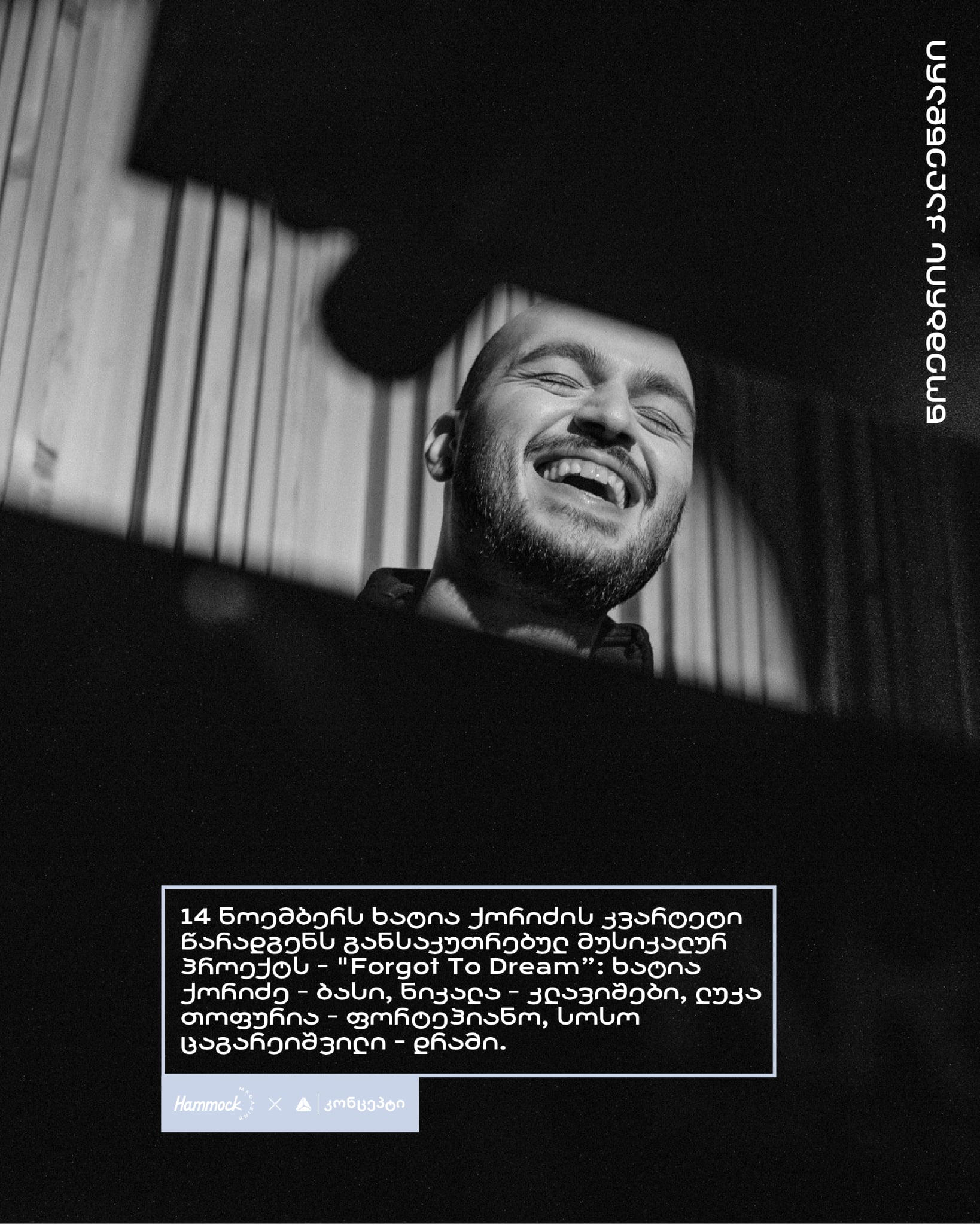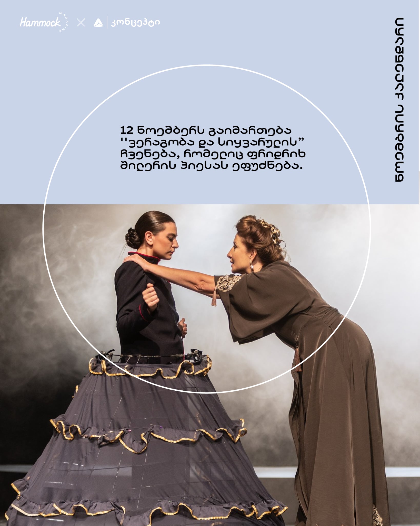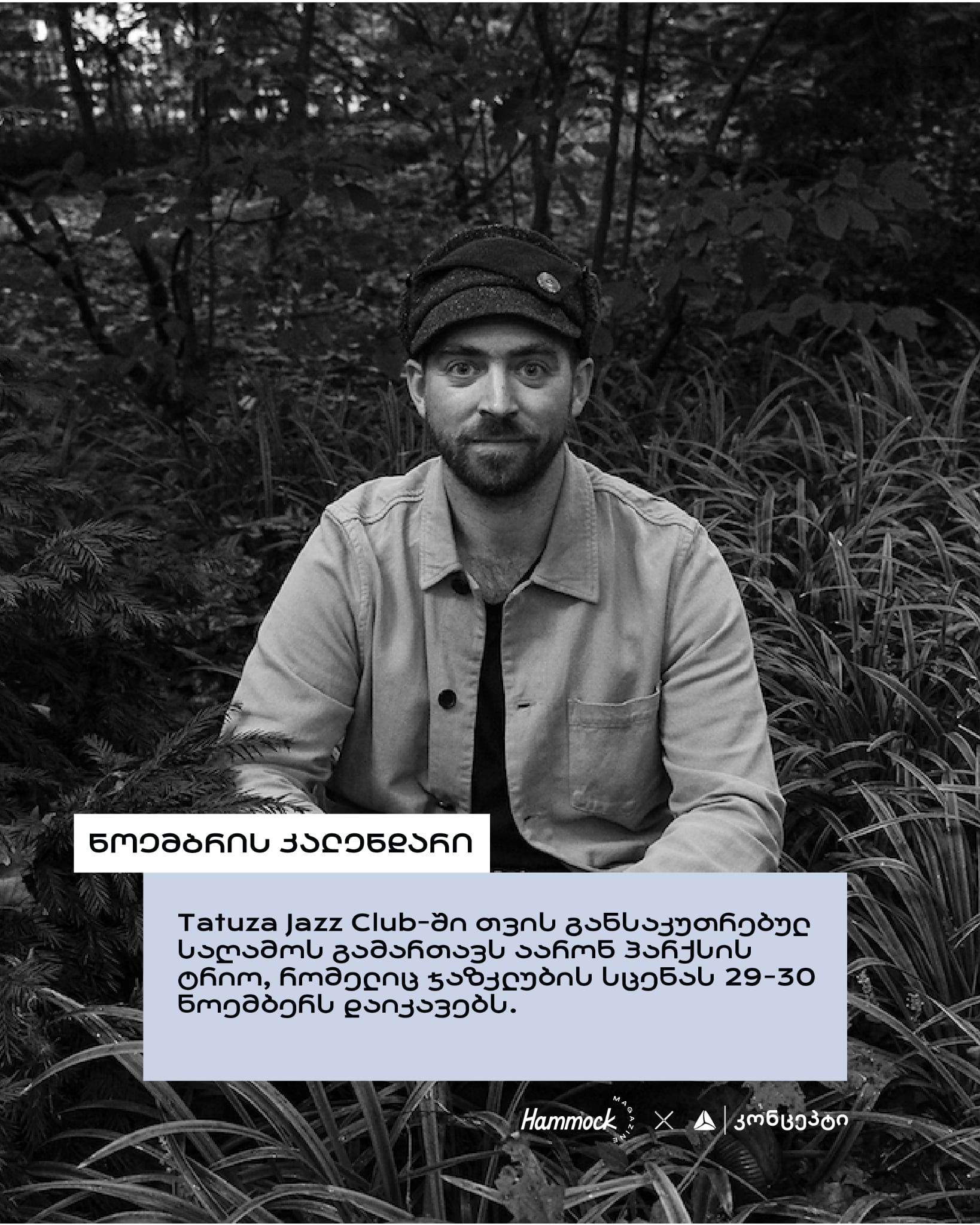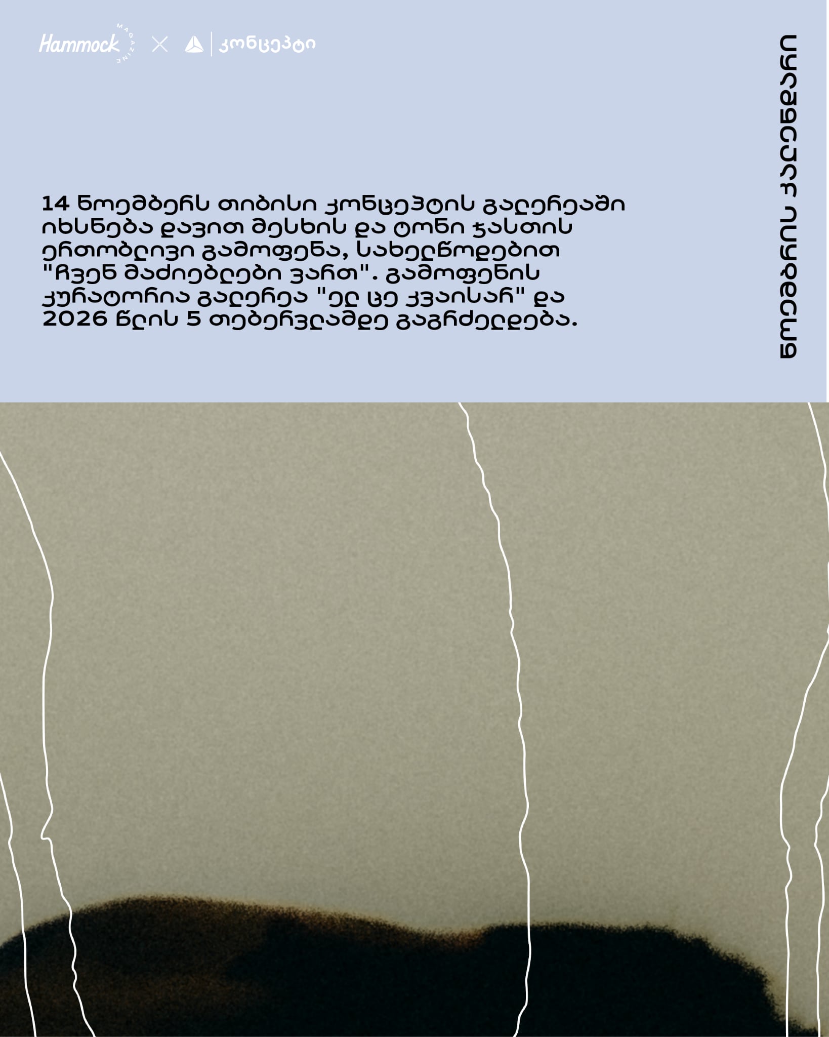 edfe1d50-3ab4-4e12-8df9-a0c17fcd4ed1.jpeg227.53 KB14 ნოემბერს თიბისი კონცეპტის გალერეაში იხსნება დავით მესხის და ტონი ჯასთის ერთობლივი გამოფენა, სახელწოდებით "ჩვენ მაძიებლები ვართ". გამოფენის კურატორია გალერეა "ელ ცე კვაისარ" და 2026 წლის 5 თებერვლამდე გაგრძელდება. 0303ea37-dfa2-474c-85d9-956f147874e9.jpeg308.05 KBახალი სეზონის და ამ თვის გამორჩეული სპექტაკლია ნიკოლოზ გოგოლის ‘’შეშლილის წერილები’’, რომლის პრემიერა 18 ნოემბერს შედგება, ჩვენებები ასევე გაიმართება 19 და 24 ნოემბერს. სპექტაკლის დამდგმელი რეჟისორი და სცენოგრაფია ლევან წულაძე, კოსტიუმების მხატვარი - ნინო სურგულაძე, ხოლო მუსიკალური გაფორმება ზურაბ გაგლოშვილს ეკუთვნის.7e0f26c6-f230-4871-9c0a-3943ff1e7252.jpeg265.62 KB12 ნოემბერს გაიმართება ''ვერაგობა და სიყვარულის” ჩვენება, რომელიც ფრიდრიხ შილერის პიესას ეფუძნება. a6fc86cb-20b2-40ec-b267-9540f8459106.jpeg484.83 KB13 და 26 ნოემბერს აჩვენებენ ფედერიკო ფელინის ამავე სახელწოდების ფილმის მიხედვით შექმნილ სპექტაკლს - ‘’ამარკორდს’’. dcd1bed1-c661-4151-bc9c-91539d725022.jpeg387.92 KB14 ნოემბერს თეატრის სცენაზე იხილავთ სპექტაკლს ‘’1921 - 1924“, ხოლო 16 და 25 ნოემბერს სცენა დაეთმობა სპექტაკლ ‘’დირიჟორს’’. 993a60f5-0ee7-41de-80ff-af39cb10ae6c.jpeg350.97 KBამ სეზონის კიდევ ერთი საინტერესო სპექტაკლია ‘’ცხვირი“, რომელიც ნიკოლოზ გოგოლის მოთხრობის თავისუფალი ინტერპრეტაციაა და მისი ჩვენება 17 ნოემბერს გაიმართება. თეატრის - „სახელოსნო 42-ის“ გენერალური სპონსორია თიბისი კონცეპტი.c916ffa1-d70f-4e9f-9e59-2c8c199570a1.jpeg459.8 KBრაც შეეხება Tatuza Jazz Club-ს, ტელეგრაფში მდებარე ჯაზკლუბი ყოველთვიურად მასპინძლობს გამოჩენილ უცხოელ და ქართველ მუსიკოსებს. თვის განსაკუთრებულ საღამოს გამართავს აარონ პარქსის ტრიო, რომელიც ჯაზკლუბის სცენას 29-30 ნოემბერს დაიკავებს. აარონ პარქსი თანამედროვე ჯაზის ერთ-ერთ ყველაზე სახელგანთქმული ჯაზპიანისტია, რომელსაც შესრულების განსაკუთრებული და დასამახსოვრებელი სტილი აქვს. პარქსთან ერთად მსმენელის წინაშე წარდგებიან პეტერ ელდი - ბასი და გრეგ ჰაჩინსონი - დრამი.8aa3c44c-b9a5-4d0a-a6b2-b93108e03292.jpeg421.7 KB14 ნოემბერს საღამოს პირველ ნაწილს გაუძღვება ნიკალა, ხოლო მოგვიანებით ხატია ქორიძის კვარტეტი ნიკალას მონაწილეობით წარადგენს განსაკუთრებულ მუსიკალურ პროექტს - "Forgot To Dream”: ხატია ქორიძე - ბასი, ნიკალა - კლავიშები, ლუკა თოფურია - ფორტეპიანო, სოსო ცაგარეიშვილი - დრამი. 16 ნოემბერს თათუზას სცენას დაიკავებს საბა ოკუჯავას ტრიო: საბა ოკუჯავა - პიანინო, დავით გოგისვანიძე - ბასი, გიორგი კაპანაძე - დრამი, ხოლო 23 ნოემბერს სცენაზე ვიხილავთ გიგა ცინცაძის კვარტეტს.3f1c9f0b-8009-4cb2-8e23-4b6accd6c94f.jpeg333 KBმთელი თვის განმავლობაში, კვირის სხვადასხვა დღეს Tatuza Jazz Club-ის საღამოებს გააფორმებს და მსმენელის წინაშე წარდგება თა
